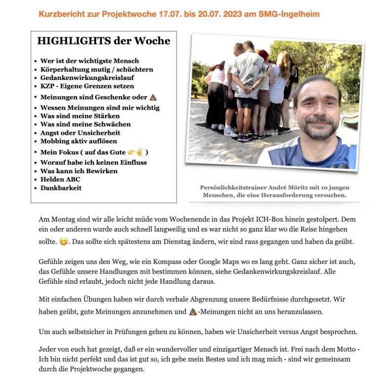 Mein selbstentwickeltes Konzept, die ICH BoX für Jugendliche durch Selbstkompetenz zur Sozialkompetenz durch einfache Übungen aus der Praxis für Resilienz und Leichtigkeit stark im Alltag. Inklusive Bewegung, Kreativität und Spaß und natürlich Fokus auf das Gute.